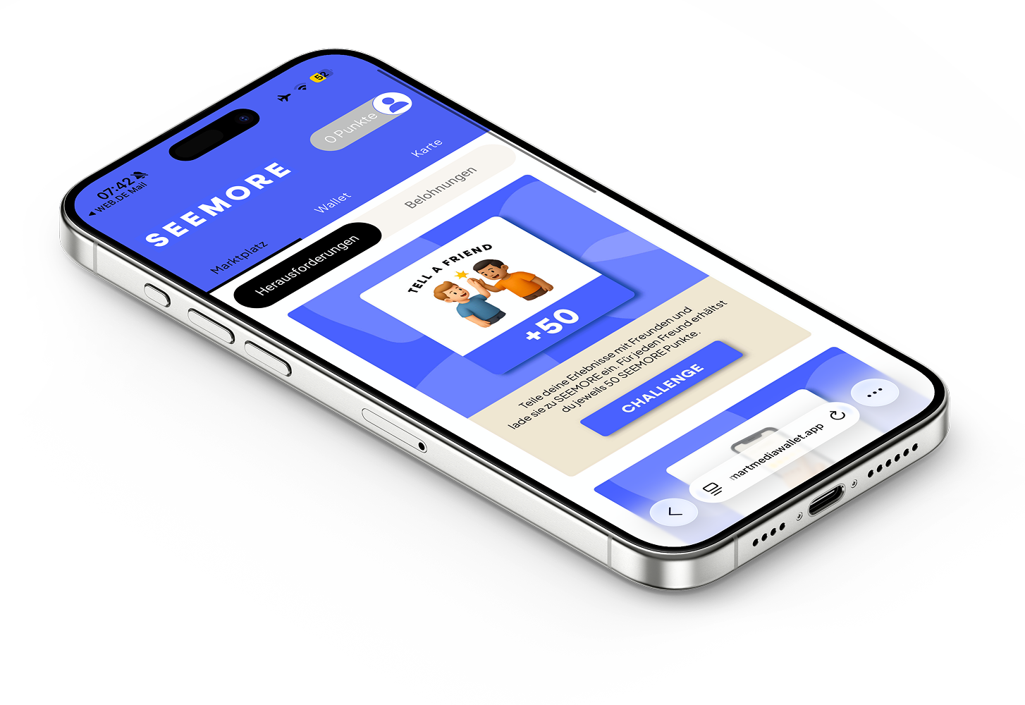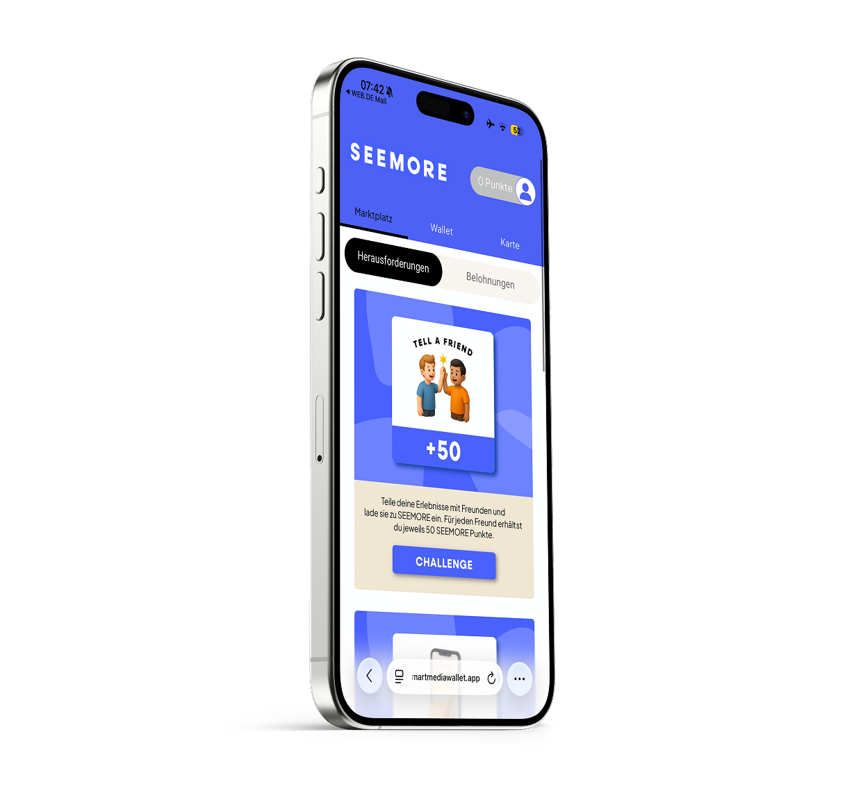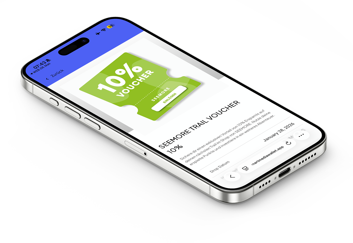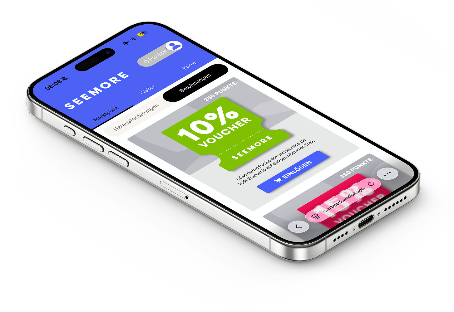 Der Marktplatz ist der Ort, an dem du deine gesammelten SEEMORE Punkte einlösen kannst. Dieser ist Bestandteil deines Wallets, in dem du auch deine Trails absolvierst, Fortschritte speicherst und Punkte sammelst. Einen Überblick über dein Punktekonto hast du jederzeit im oberen rechten Bereich deines Wallets.